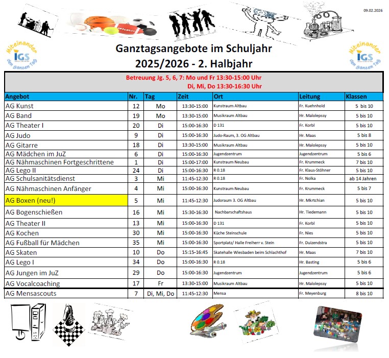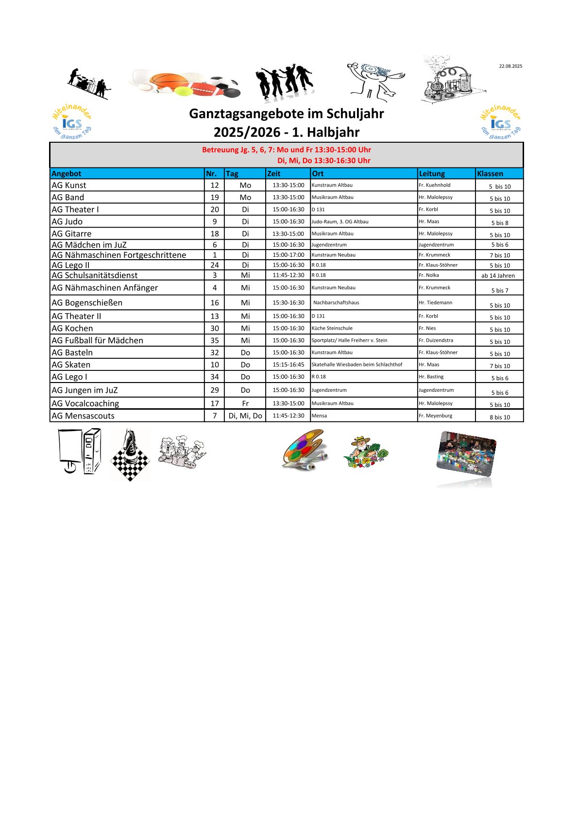 Die Angebote orientieren sich an den Zielen unseres Leitbildes sowie den Interessen der Jugendlichen und finden in der Schule, der Sporthalle und externen Räumlichkeiten statt.