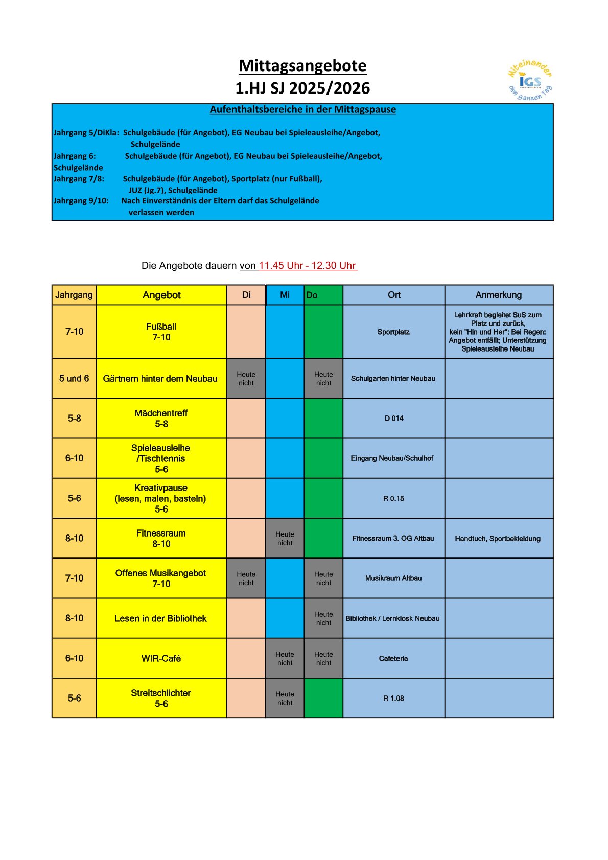 Die Mittagspause findet für alle Jahrgänge dienstags bis donnerstags von 11:45 Uhr – 12:30 statt. Zur Gestaltung der freien Zeit gibt es in der Mittagspause frei wählbare Angebote sowie feste AGs, die den unterschiedlichen Interessen und Neigungen der Schülerinnen und Schüler gerecht werden. Die Angebote haben keinen Unterrichtscharakter. Sie decken die Bereiche Bewegung, Entspannung und Spiel ab. So gibt es Räume zum Spielen oder Lesen, Streitschlichter, Angebote speziell für Mädchen, Bewegungsmöglichkeiten auf den Sportanlagen oder dem Hof und vieles mehr.